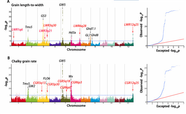 水稻粒型和堊白性狀解析是當前水稻主要農藝性狀遺傳基礎研究的熱點之一。水稻粒型和堊白性狀的基因發(fā)掘已有一些相關報道,但這兩種性狀在雜交稻中的遺傳基礎尚不明晰。研究人員在前期完成水稻產量雜種優(yōu)勢遺傳解析的基礎上,考察了涵蓋秈秈交和秈粳交在內的17套代表性F2群體的水稻外觀品質性狀,用全基因組關聯(lián)分析的方法解析了雜交稻粒型和堊白性狀的分子基礎及其各顯著位點的遺傳效應,同時建立了基于基因型的水稻品質表型的預測模型。該研究對于發(fā)掘優(yōu)異基因資源和水稻外觀品質性狀的高效分子育種具有積極意義。