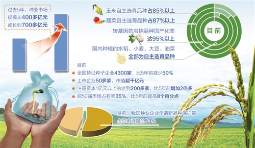 過去的五年,是我國種業(yè)發(fā)展的黃金五年:種業(yè)市場規(guī)模從400多億元成長到700多億元,種業(yè)企業(yè)不僅加快“走出去”,而且初步改變了“小散弱”格局,在與“洋種子”的競爭中一改頹勢,品種、人才、市場都發(fā)生了大變化