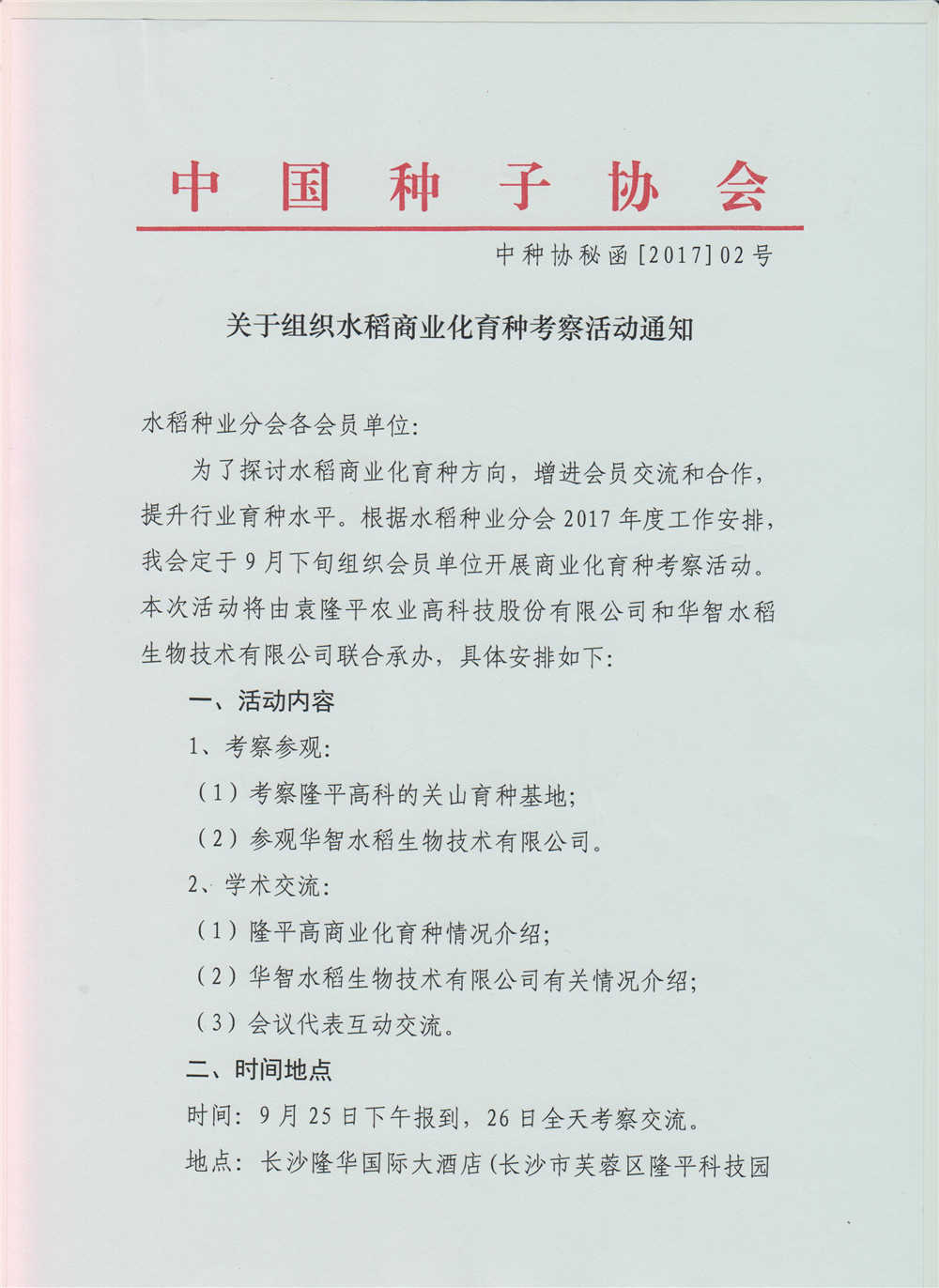 中國種子協(xié)會組織水稻商業(yè)化育種考察活動通知