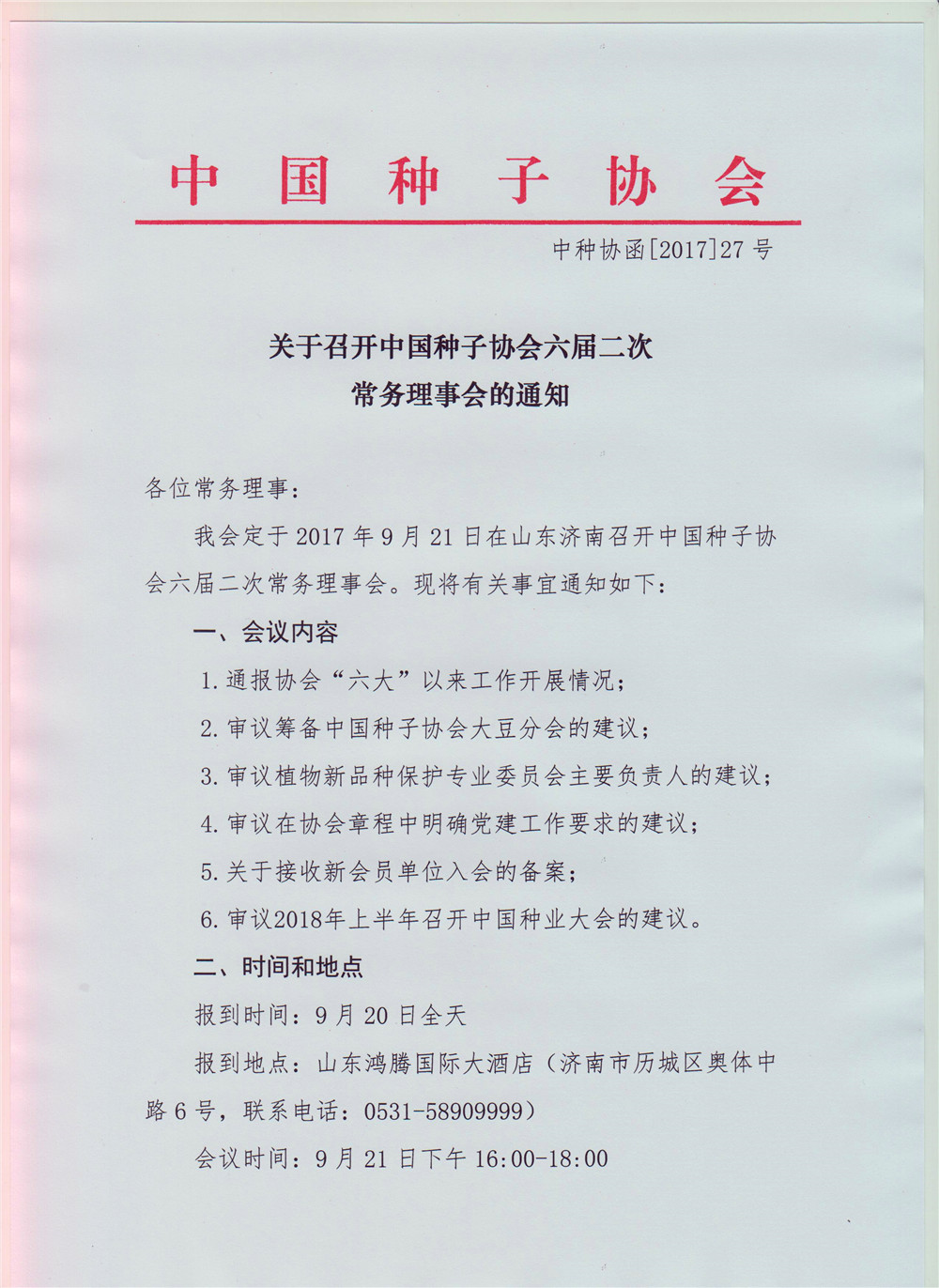中國(guó)種子協(xié)會(huì)六屆二次常務(wù)理事會(huì)會(huì)議的通知