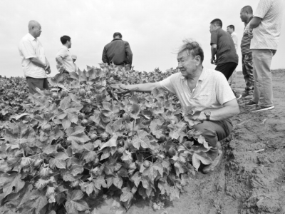 國欣種業(yè)選育的棉種已經(jīng)覆蓋長江、黃河流域主產(chǎn)棉區(qū)。近幾年重點(diǎn)向新疆棉區(qū)發(fā)力,現(xiàn)已投資2億多元,在北疆、南疆建有繁棉種農(nóng)場4萬畝。輪臺縣的棉種加工廠日產(chǎn)包衣棉種140噸。近日,國欣農(nóng)村技術(shù)服務(wù)總會董事長盧國欣帶領(lǐng)專家、顧問團(tuán)隊(duì),對11個棉花育種基地進(jìn)行了考察,一般每畝平均結(jié)有成桃8萬個左右,預(yù)計(jì)畝產(chǎn)籽棉400公斤左右,其中塔河、庫車農(nóng)場管理較好的約3000畝棉田,每畝平均成桃近10萬個,預(yù)計(jì)畝產(chǎn)籽棉500公斤,高于內(nèi)地籽棉產(chǎn)量1倍以上。圖為育種家張德才在考察棉花新品系10—6B。 余宏章攝