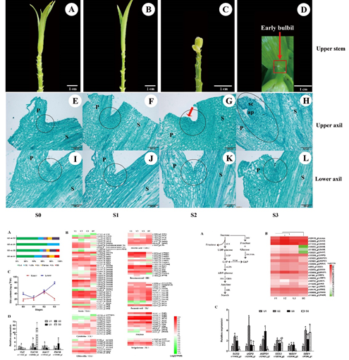 該研究運(yùn)用解剖學(xué)、轉(zhuǎn)錄組學(xué)、生理學(xué)和分子生物學(xué)相結(jié)合的手段系統(tǒng)地研究了卷丹莖中、上部葉腋珠芽形成的機(jī)制。卷丹珠芽形成于地上莖與葉片連接的葉腋處,是由葉柄基部近軸端表皮下層的薄壁細(xì)胞分裂分化而來(lái)。根據(jù)解剖觀察,取莖上部腋生珠芽形成不同階段的葉腋組織及下部不形成珠芽的葉腋組織進(jìn)行轉(zhuǎn)錄組測(cè)序和表達(dá)譜分析,研究發(fā)現(xiàn)淀粉和糖代謝及植物激素信號(hào)轉(zhuǎn)導(dǎo)通路在珠芽形成中發(fā)揮了重要作用。淀粉的合成和積累可促進(jìn)卷丹珠芽的啟動(dòng)。此外,激素在珠芽形成中表現(xiàn)出不同的調(diào)控模式。生長(zhǎng)素促進(jìn)珠芽的啟動(dòng),但會(huì)抑制珠芽的進(jìn)一步形成;細(xì)胞分裂素的高合成和低降解導(dǎo)致了卷丹上部葉腋珠芽的形成。相關(guān)結(jié)論通過(guò)生理學(xué)和分子生物學(xué)實(shí)驗(yàn)進(jìn)一步得以驗(yàn)證。