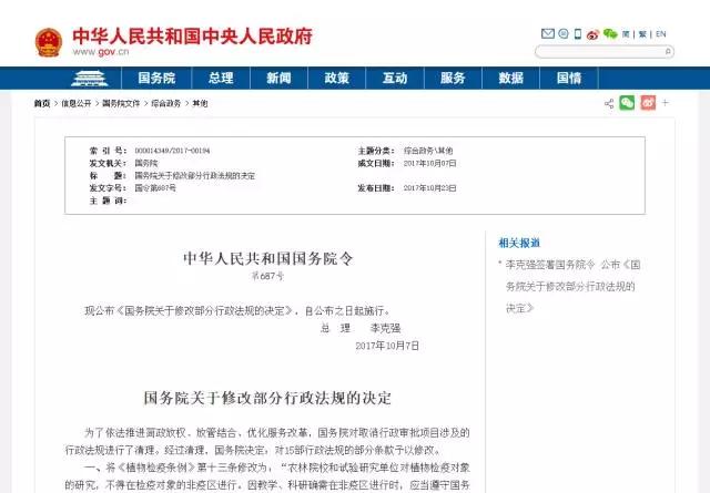 10月23日,澎湃新聞(www.thepaper.cn)從中國政府網(wǎng)獲悉,國務(wù)院總理李克強(qiáng)日前簽署國務(wù)院令,公布《國務(wù)院關(guān)于修改部分行政法規(guī)的決定》(下稱《決定》),自公布之日起施行?!稕Q定》中對《農(nóng)業(yè)轉(zhuǎn)基因生物安全管理?xiàng)l例》進(jìn)行了修改,其中,《農(nóng)業(yè)轉(zhuǎn)基因生物安全管理?xiàng)l例》的2條內(nèi)容被刪去,5條內(nèi)容被修改。