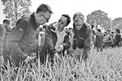 圖為中國科學院院士張啟發(fā)(中)與外國專家在湖北省江陵縣三湖農場再生稻示范現場交流。