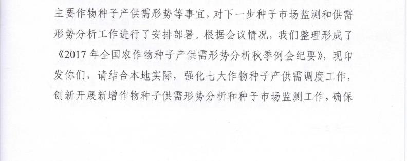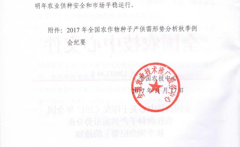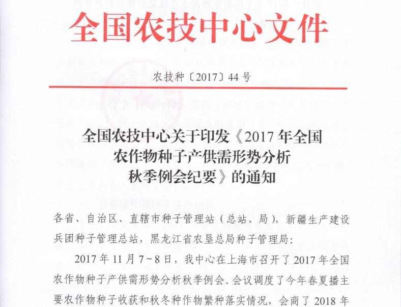 全國農(nóng)技中心關(guān)于印發(fā)《2017年全國農(nóng)作物種子產(chǎn)供需形勢分析秋季例會紀(jì)要》的通知