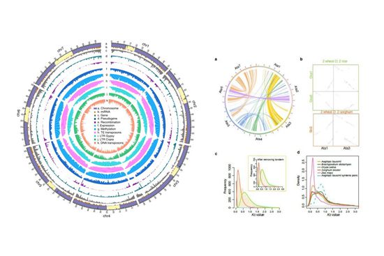 近年來,該團隊利用二代、三代等測序技術(shù)與最新的組裝技術(shù),對D基因組重新測序與組裝,將組裝質(zhì)量提高210 倍,完成了染色體級別的D基因組精細圖譜的繪制。利用高質(zhì)量的組裝結(jié)果,準確地進行了基因注釋,構(gòu)建了基因分布圖、基因表達圖、假基因分布圖、重復(fù)序列分布圖、甲基化分布圖、重組率分布圖和smallRNA分布圖。研究發(fā)現(xiàn),粗山羊草基因組中有一批基因在近期發(fā)生了復(fù)制。研究還重點分析了轉(zhuǎn)座子對基因組結(jié)構(gòu)、基因復(fù)制、假基因形成與基因表達的影響,發(fā)現(xiàn)有近1/2的基因中攜帶有TE,是已測序基因組中攜帶TE基因最多的物種,也是迄今為止報道的假基因數(shù)量最多的物種。TE通常還抑制基因的表達。該研究還首次把近30年來三代分子標記和之前檢測到的重要農(nóng)藝性狀基因和QTL定位到小麥D基因組上,獲得一個完整的整合圖譜。