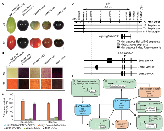 花青素是目前所發(fā)現(xiàn)的清除人體內(nèi)自由基最有效的天然抗氧化劑,具有抗衰老、抗輻射、抗過敏、增進(jìn)視力、改善睡眠、預(yù)防癌癥、預(yù)防心腦血管疾病等功效。花青素廣泛存在于植物中。普通栽培番茄植株一般含有一定數(shù)量的花青素,然而果實(shí)通常不產(chǎn)生花青素。但是某些野生種番茄含有Aft、Abg或atv等遺傳位點(diǎn),其果實(shí)與紫色茄子相似,因表皮能產(chǎn)生花青素而呈紫色。國(guó)外育種者通過傳統(tǒng)育種手段將上述遺傳位點(diǎn)轉(zhuǎn)育到普通栽培番茄中,已經(jīng)培育出高花青素的紫果番茄品種。然而,這些遺傳位點(diǎn)具體的分子遺傳機(jī)制尚不清楚。
