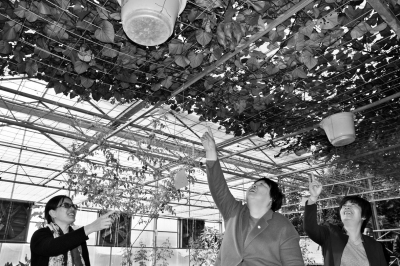 近日,游客在江蘇省連云港市東海縣桃林鎮(zhèn)北芹蔬菜博覽園里觀賞結(jié)在樹上的地瓜。該園去年從中國農(nóng)科院引種的地瓜新品種——“木本地瓜”,顛覆了常規(guī)地瓜生長在土壤里的模式。該地瓜采用無土栽培,靠吸收營養(yǎng)液攀爬在架子上,結(jié)出的果實裸露在空中。
