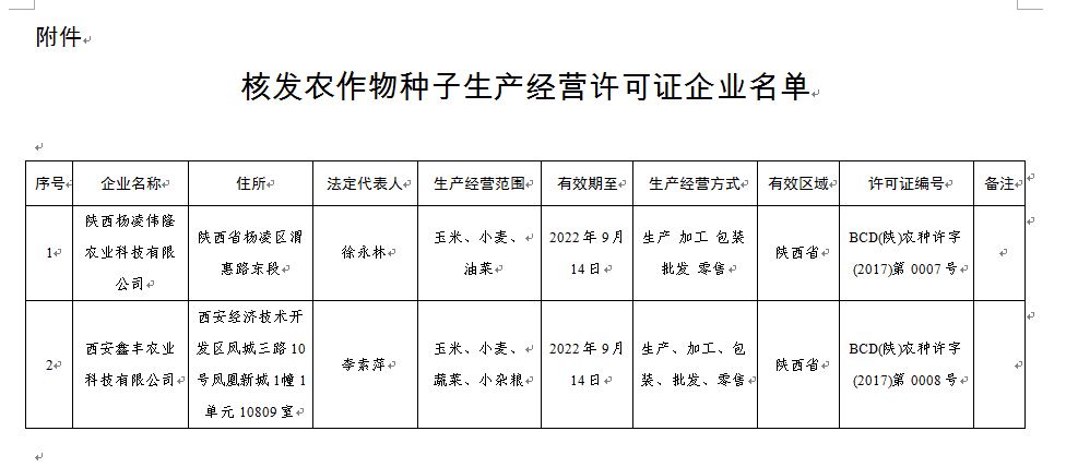 根據(jù)《中華人民共和國(guó)種子法》《農(nóng)作物種子生產(chǎn)經(jīng)營(yíng)許可管理辦法》及《植物新品種保護(hù)條例》有關(guān)規(guī)定,經(jīng)審核,同意為陜西楊凌偉隆農(nóng)業(yè)科技有限公司、西安鑫豐農(nóng)業(yè)科技有限公司2家企業(yè)核發(fā)《農(nóng)作物種子生產(chǎn)經(jīng)營(yíng)許可證》(詳見(jiàn)附件)。