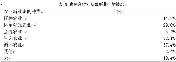 農(nóng)民合作社不斷引入新技術(shù),發(fā)展新業(yè)態(tài)。接受調(diào)查的合作社中,從事生態(tài)農(nóng)業(yè)的最多,其比例達(dá)到52.1%。另有37.4%的合作社從事循環(huán)農(nóng)業(yè),29.0%的合作社從事休閑觀光農(nóng)業(yè)。有40.9%的合作社從事了兩種及兩種以上新業(yè)態(tài)。