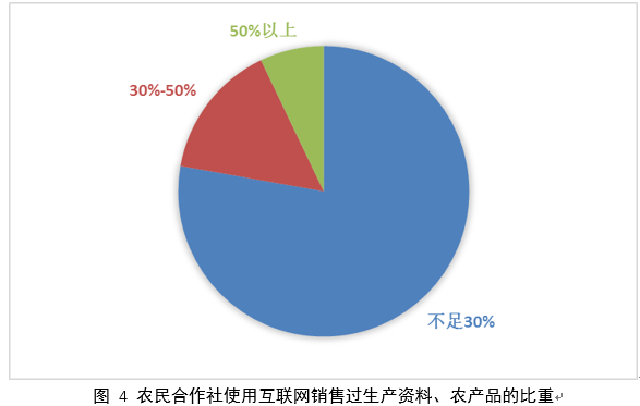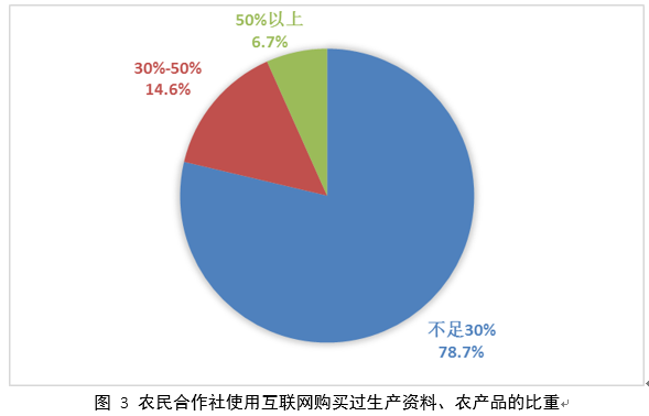 在電子商務(wù)方面,專(zhuān)業(yè)合作社使用互聯(lián)網(wǎng)購(gòu)買(mǎi)生產(chǎn)資料、農(nóng)產(chǎn)品和使用互聯(lián)網(wǎng)銷(xiāo)售生產(chǎn)資料、農(nóng)產(chǎn)品的行為均高于預(yù)期。無(wú)論是使用互聯(lián)網(wǎng)購(gòu)買(mǎi)農(nóng)產(chǎn)品、生產(chǎn)資料還是使用互聯(lián)網(wǎng)銷(xiāo)售農(nóng)產(chǎn)品、生產(chǎn)資料的合作社數(shù)量,均要高于未使用互聯(lián)網(wǎng)購(gòu)買(mǎi)和銷(xiāo)售農(nóng)產(chǎn)品、生產(chǎn)資料的合作社數(shù)量。使用互聯(lián)網(wǎng)銷(xiāo)售農(nóng)產(chǎn)品、生產(chǎn)資料的農(nóng)民合作社數(shù)量要比使用互聯(lián)網(wǎng)購(gòu)買(mǎi)農(nóng)產(chǎn)品、生產(chǎn)資料的農(nóng)民合作社數(shù)量高出5.3個(gè)百分點(diǎn)。