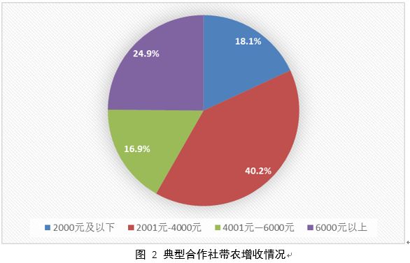 農(nóng)民合作社表現(xiàn)出了較強(qiáng)的帶農(nóng)增收能力。在接受調(diào)查的農(nóng)民合作社當(dāng)中,能夠帶動(dòng)入社農(nóng)戶(hù)戶(hù)均增收2000-4000元的合作社達(dá)到40.2%,6000元以上的達(dá)到24.9%,2000元以下的18.1%,4000-6000元的達(dá)到16.9%。