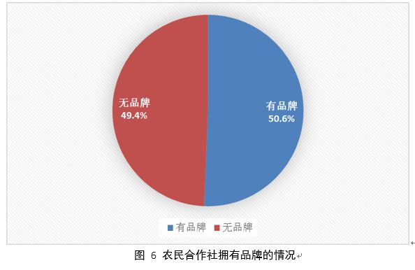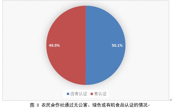 目前,已經(jīng)有43.7%的農(nóng)民合作社實(shí)施了標(biāo)準(zhǔn)化的生產(chǎn)和服務(wù),但仍有56.3%的農(nóng)民合作社沒(méi)有實(shí)施標(biāo)準(zhǔn)化的生產(chǎn)和服務(wù)。有29.6%的農(nóng)民合作社擁有自主品牌,有14.5%的農(nóng)民合作社能夠擁有兩個(gè)及兩個(gè)以上的品牌。有65.5%的農(nóng)民合作社注冊(cè)了商標(biāo),有15.4%的農(nóng)民合作社能夠注冊(cè)兩個(gè)及兩個(gè)以上的商標(biāo)。有49.9%的農(nóng)民合作社有產(chǎn)品已通過(guò)國(guó)家無(wú)公害、綠色或有機(jī)食品認(rèn)證,有23.7%的農(nóng)民合作社能夠有兩種以上產(chǎn)品通過(guò)國(guó)家無(wú)公害、綠色或有機(jī)食品認(rèn)證。