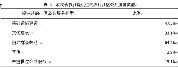 在提供農(nóng)村社區(qū)公共服務(wù)方面,農(nóng)民合作社積極參與基礎(chǔ)設(shè)施建設(shè)、文化建設(shè)并且扶難濟(jì)困。參與調(diào)查的農(nóng)民合作社中,有47.5%的合作社提供過(guò)農(nóng)村社區(qū)基礎(chǔ)設(shè)施建設(shè),有33.1%的合作社為農(nóng)村社區(qū)文化建設(shè)做出過(guò)貢獻(xiàn),有64.2%的合作社為社區(qū)內(nèi)的困難群眾提供過(guò)幫助。但是,也應(yīng)當(dāng)看到,有15.1%的合作社在農(nóng)村社區(qū)公共服務(wù)方面投入不足。