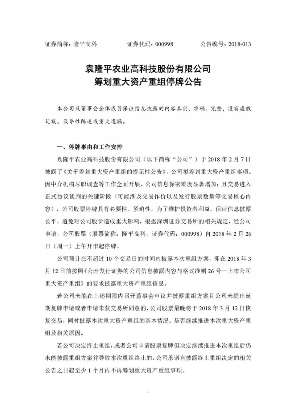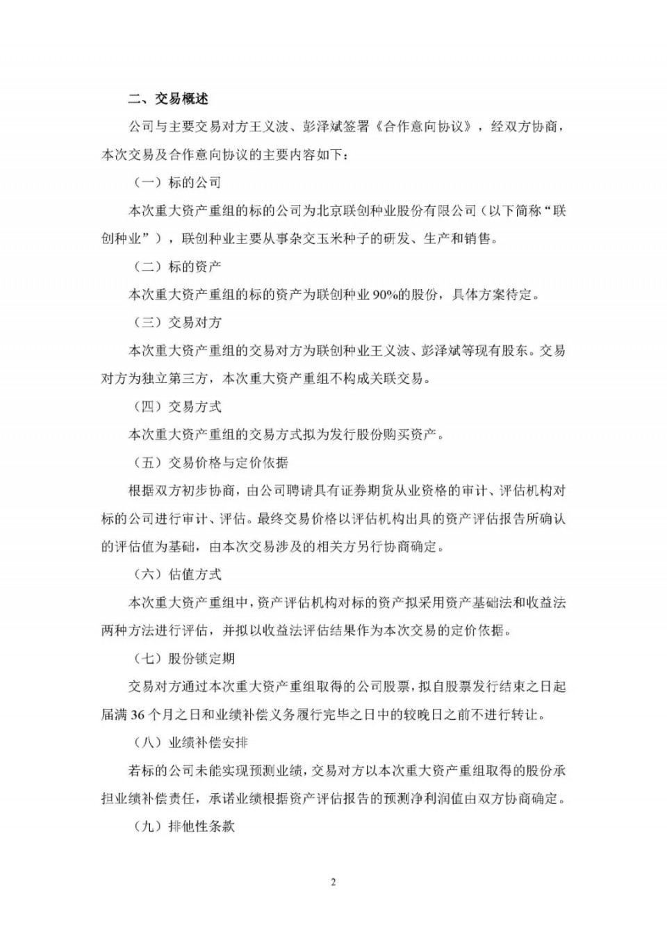 與主要交易對(duì)方王義波、彭澤斌簽署《合作意向協(xié)議》,公司擬發(fā)行股份購(gòu)買聯(lián)創(chuàng)種業(yè)90%股份,股票2月26日起停牌。