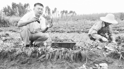 圖為海南省農(nóng)科院的甘薯專家(左)在田間查看作物長勢。王玉潔攝