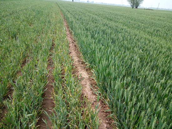 一壟之隔的兩塊麥田形成鮮明對(duì)比:左側(cè)一塊受災(zāi)嚴(yán)重,大量麥穗枯死,顯得青黃不接;右側(cè)一塊綠油油的,出滿麥穗,長(zhǎng)勢(shì)喜人。