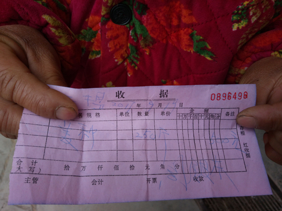 一名村民提供的2017年9月19日購(gòu)麥種收據(jù)上,名稱一欄寫著麥種,并沒(méi)有具體的名稱,后面?zhèn)渥⒅飻?shù)和錢數(shù),開(kāi)票和收款人處簽名為周銀東。村民們說(shuō),就是那個(gè)周銀東賣給他們麥種的。