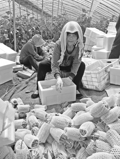 在濰坊市昌樂縣偉圣示范園的大棚里,種植戶將采摘下來的“博洋9”套袋、裝箱。