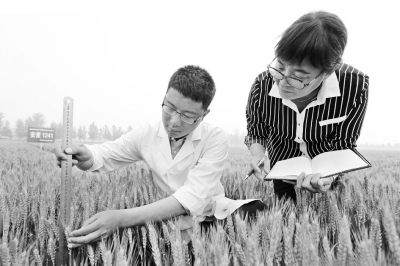 5月12日,在河南省安陽(yáng)市北關(guān)區(qū)柏莊鎮(zhèn)境內(nèi)的安陽(yáng)市農(nóng)科院試驗(yàn)基地內(nèi),該市農(nóng)科院小麥所工作人員正在實(shí)地測(cè)量“安麥1241”的株高與穗長(zhǎng)。