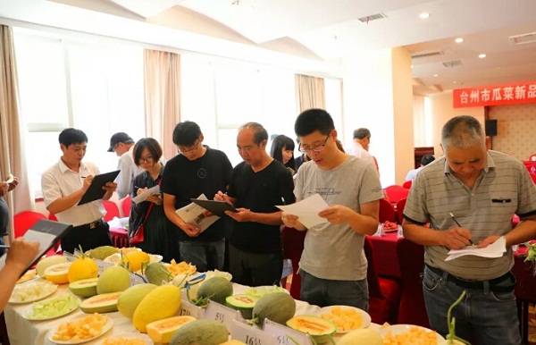 各位專家現(xiàn)場首先考察觀摩了省級瓜菜創(chuàng)新平臺黃巖和椒江展示點、市本級甜瓜展示基地。對參展的
