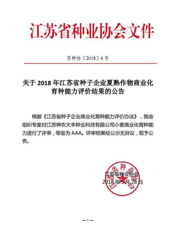 根據(jù)《江蘇省種子企業(yè)商業(yè)化育種能力評(píng)價(jià)辦法》,我會(huì)組織專家對江蘇神農(nóng)大豐種業(yè)科技有限公司小麥商業(yè)化育種能力進(jìn)行了評(píng)審,等級(jí)為AAA。評(píng)審結(jié)果經(jīng)公示無異議,現(xiàn)予公告。