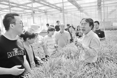 圖為與會(huì)同志在北京市農(nóng)林科學(xué)院蔬菜研究中心通州于家務(wù)基地,參觀考察無(wú)土栽培技術(shù),該中心研究員劉明池在介紹“水培韭菜”生產(chǎn)情況。