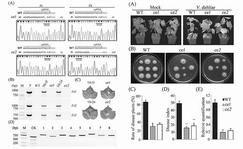 該研究通過基因組編輯技術(shù)創(chuàng)制出了無轉(zhuǎn)基因的編輯突變體ce1和ce2,對(duì)棉花黃萎病有較高的抗性,為提高棉花抗黃萎病能力提供了優(yōu)異的種質(zhì)資源。同時(shí),該研究還首次闡明了棉花基因在A和D兩個(gè)亞組中同時(shí)編輯的規(guī)律和鑒定方法。