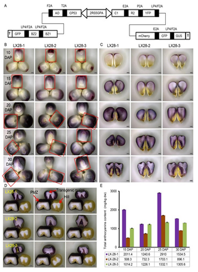 花青素的合成是多個酶參與的復(fù)雜過程,調(diào)控相對復(fù)雜。為了提高玉米籽粒中花青素的含量,該研究以玉米胚中特異表達(dá)的雙向啟動子PZmBD1為基礎(chǔ),搜集胚乳特異性順式作用元件并根據(jù)其特性組成不同的組合融合到PZmBD1中,得到種子特異表達(dá)的雙向啟動子P2R5SGPA。以該啟動子驅(qū)動花青素合成的調(diào)控基因ZmC1和ZmR2以及結(jié)構(gòu)基因ZmBZ1和ZmBZ2,構(gòu)建了多基因表達(dá)體系,穩(wěn)定轉(zhuǎn)化玉米實現(xiàn)了花青素在玉米胚和胚乳中合成,積累量高達(dá)2910mg/kg 干重,創(chuàng)制了高花青素紫玉米種質(zhì)。
