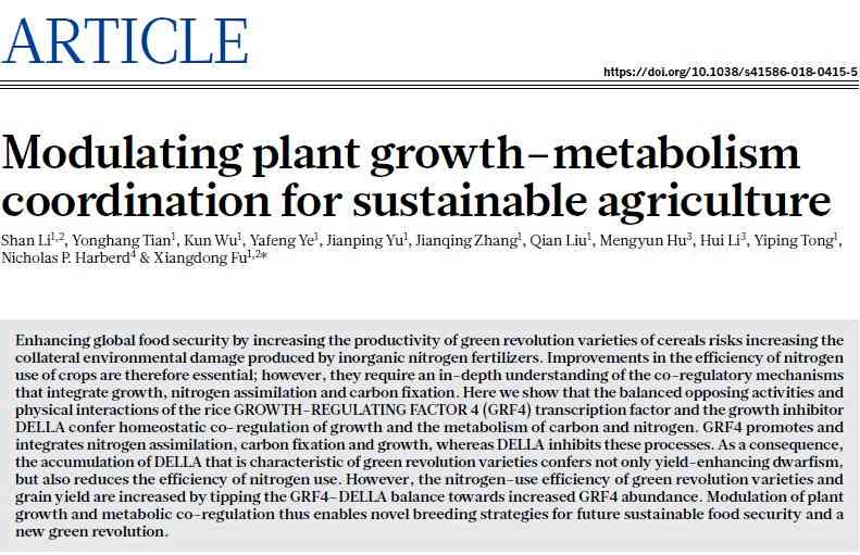 傅向東等人認(rèn)為,GRF4新功能的發(fā)現(xiàn)不僅豐富了對(duì)于赤霉素信號(hào)傳導(dǎo)分子機(jī)制的認(rèn)識(shí),而且從分子水平闡明了“綠色革命”矮桿育種伴隨氮肥利用效率低下的原因,并提出了明確的解決方案。