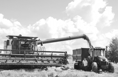 公司組織職工利用大型直收機(jī)械搶收龍麥35春