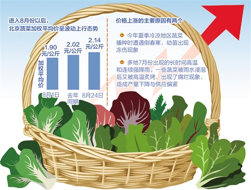 北京新發(fā)地農(nóng)副產(chǎn)品批發(fā)市場統(tǒng)計數(shù)據(jù)顯示,進(jìn)入8月份以后,北京蔬菜加權(quán)平均價呈波動上行態(tài)勢。8月24日加權(quán)平均價是2.14元/公斤,比8月1日的1.90元/公斤上漲12.63%,比去年同期的2.02元/公斤上漲5.94%。
