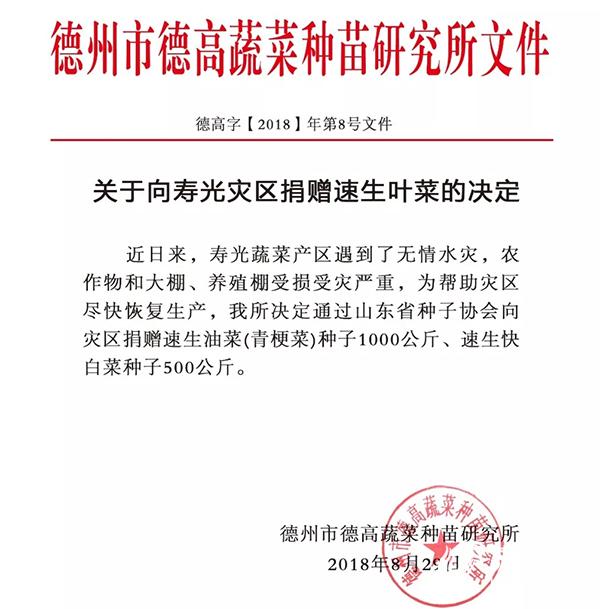 齊魯網(wǎng)德州8月29日訊 近日,濰坊壽光蔬菜產(chǎn)區(qū)遇到了無情水災,農(nóng)作物和大棚、養(yǎng)殖棚受損受災嚴重,為幫助災區(qū)盡快恢復生產(chǎn),8月29日,德州市德高蔬菜種苗研究所決定通過山東省