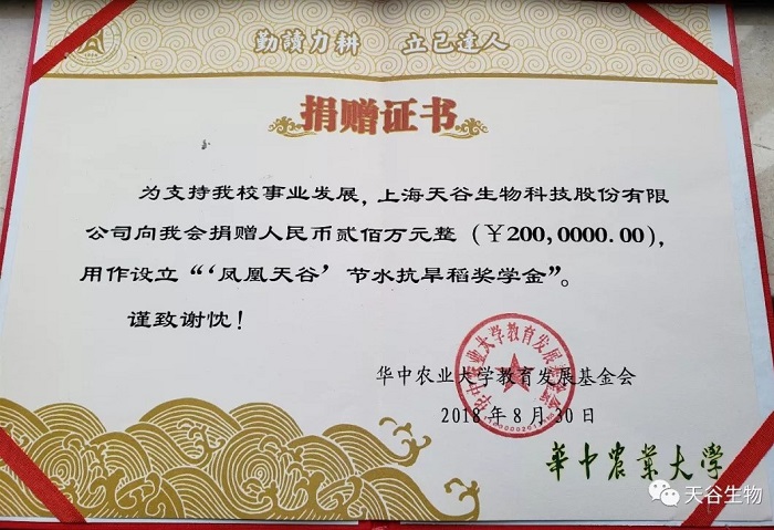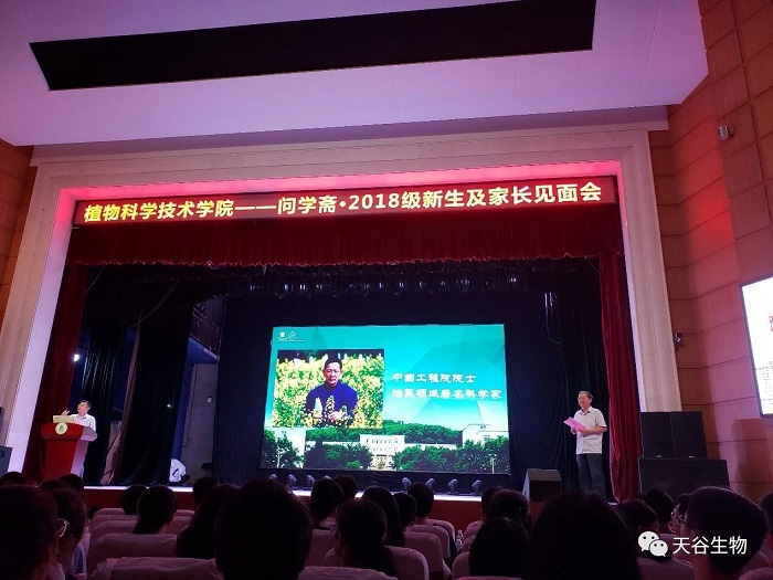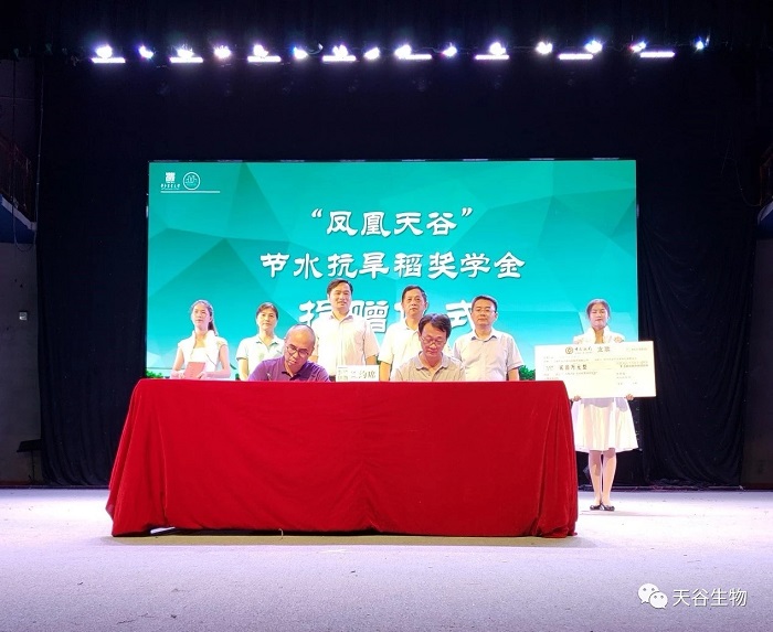 8月30日晚,在湖北武漢華中農(nóng)業(yè)大學(xué)大學(xué)生活動中心劇院,舉辦了華中農(nóng)業(yè)大學(xué)植物科學(xué)技術(shù)學(xué)院•2018大學(xué)第一課暨“‘鳳凰天谷’節(jié)水抗旱稻獎學(xué)金”捐贈儀式。在近千名師生及新生家長的見證下,“‘鳳凰天谷’節(jié)水抗旱稻獎學(xué)金”在華中農(nóng)業(yè)大學(xué)設(shè)立,以獎勵華中農(nóng)業(yè)大學(xué)植物科學(xué)技術(shù)學(xué)院品學(xué)兼優(yōu)的全日制在讀本科生、碩博研究生,特別是立志和正在從事綠色超級稻(節(jié)水抗旱稻)推廣、研發(fā)工作的優(yōu)秀學(xué)生。中國工程院院士、第三世界科學(xué)院院士、華中農(nóng)業(yè)大學(xué)傅廷棟教授、華中農(nóng)業(yè)大學(xué)原副校長張獻(xiàn)龍教授、華中農(nóng)業(yè)大學(xué)副書記王從嚴(yán)、植物科學(xué)技術(shù)學(xué)院書記朱正寧、植物科學(xué)技術(shù)學(xué)院院長嚴(yán)建兵、上海市農(nóng)業(yè)生物基因中心書記、主任龔麗英等專家領(lǐng)導(dǎo)以及上海天谷生物科技股份有限公司董事長羅利軍和總經(jīng)理金祖平出席了相關(guān)活動和捐贈儀式。