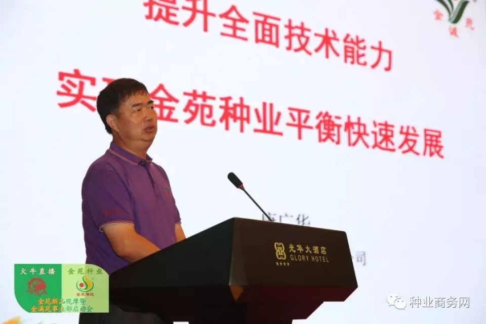 下午14:30分,室內(nèi)研討會議首先由金苑種業(yè)董事長康廣華以《提升全面技術能力,實現(xiàn)金苑種業(yè)平衡快速發(fā)展》為主題報告。