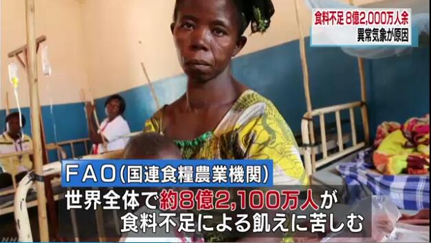 【環(huán)球網(wǎng)報(bào)道 記者 屈騰飛】日本NHK電視臺(tái)9月12日?qǐng)?bào)道稱(chēng),聯(lián)合國(guó)糧農(nóng)組織(FAO)11日發(fā)布估算數(shù)據(jù)顯示,2017年全世界約有8.2億人面臨糧食短缺問(wèn)題,這一數(shù)字約全球總?cè)丝诘木欧种弧?/p>
