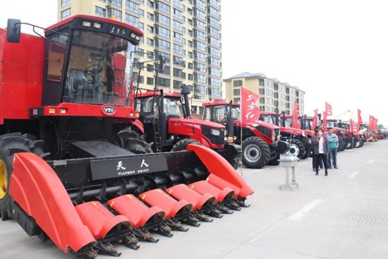 公司的百余輛大型農(nóng)機(jī)具排列有序,彰顯出