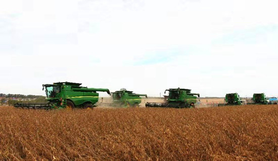 大豆收割、脫粒、秸稈還田等“一條龍”全程機(jī)械化作業(yè)演示