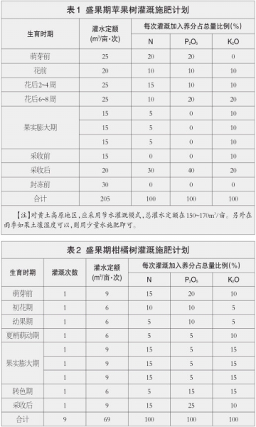 (三)水肥一體化。畝產(chǎn)3000千克蘋(píng)果園水肥一體化追肥量一般為:純氮(N)9~15千克,純磷(P2O5)4.5~7.5千克,純鉀(K2O)10~17.5千克,各時(shí)期氮、磷、鉀施用比例見(jiàn)表1。