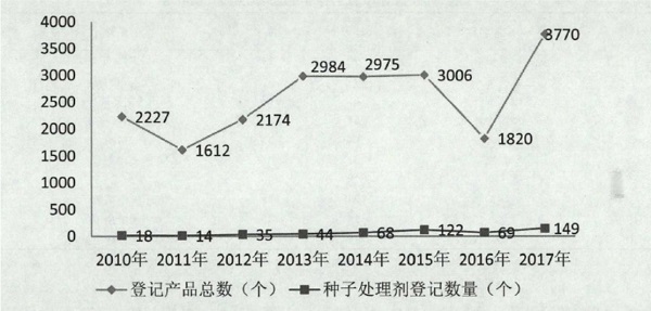 2017年新增登記產(chǎn)品3693個,其中種子處理劑153個,包括單劑85個,混劑68個。