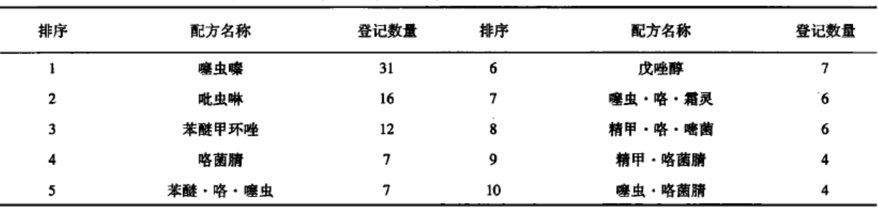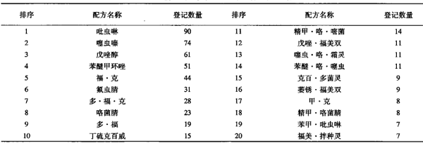 表2 登記前20位的種子處理劑配方及產(chǎn)品數(shù)量