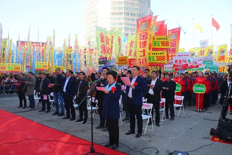 開(kāi)幕式上,河南省種子協(xié)會(huì)現(xiàn)場(chǎng)宣布了2017-2018年度河南省縣域優(yōu)秀種子經(jīng)銷商評(píng)選結(jié)果,并舉行了頒獎(jiǎng)儀式。來(lái)自48家河南種子誠(chéng)信企業(yè)的代表在河南省種子協(xié)會(huì)副會(huì)長(zhǎng)、滑豐種業(yè)董事長(zhǎng)趙秀珍的帶領(lǐng)下鄭重宣誓:“誠(chéng)信為本,依法經(jīng)營(yíng);質(zhì)量第一,互惠共贏;信譽(yù)至上,公平競(jìng)爭(zhēng);河南種業(yè),發(fā)展共榮。”將整個(gè)開(kāi)幕式推向高潮。隨后,河南省種子管理站站長(zhǎng)馬運(yùn)糧宣布展覽會(huì)開(kāi)幕。