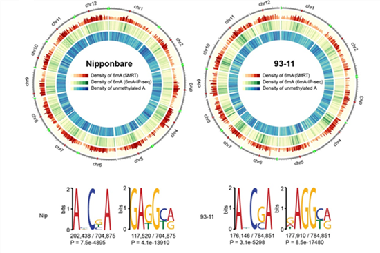該研究以水稻功能基因組學(xué)研究中應(yīng)用廣泛的粳稻“日本晴”和秈稻“93-11”為研究材料,繪制了全基因組腺嘌呤甲基化修飾圖譜,發(fā)現(xiàn)其參與生長發(fā)育、光合作用、逆境適應(yīng)等生物學(xué)功能,并在調(diào)控秈稻和粳稻響應(yīng)外界環(huán)境脅迫方面具有重要功能。此外,該研究還大幅度提升了“日本晴”和“93-11”基因組的組裝質(zhì)量和注釋準確度,可為基因序列分析、功能預(yù)測及研究提供基礎(chǔ),并對高質(zhì)量水稻基因組的組裝具有指導(dǎo)意義。