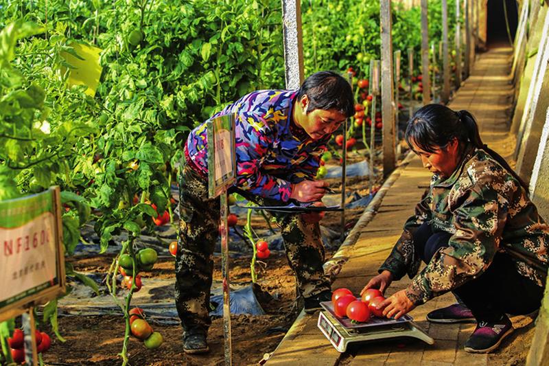12月18日,在饒陽縣蔬菜品種測試基地溫室里,種植戶在測量西紅柿產量。