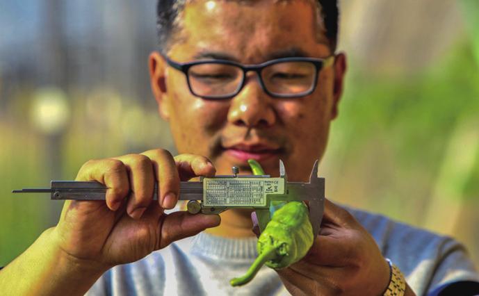 12月18日,在饒陽縣蔬菜品種測試基地溫室里,技術人員在測量辣椒的直徑。