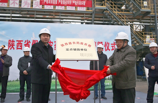 陜西省農(nóng)業(yè)農(nóng)村廳總經(jīng)濟(jì)師李育江、陜西省生態(tài)環(huán)境廳副巡視員趙生山為農(nóng)藥廢棄物處置定點單位揭牌