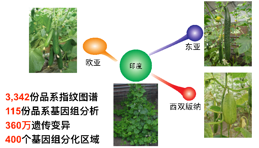 為加快蔬菜遺傳育種研究進程,蔬菜花卉所研究人員抓住新一代基因組測序技術出現(xiàn)的契機,破解了第一個蔬菜作物-黃瓜的基因組遺傳密碼,以此為基礎,研究了世界上主要黃瓜資源的全基因組遺傳變異,證實了黃瓜原產(chǎn)于印度,經(jīng)過人類馴化選擇成為人們喜歡的蔬菜,后來傳播到不同地域,形成了三個主要類型:歐亞黃瓜、東亞黃瓜、西雙版納黃瓜,發(fā)現(xiàn)東亞黃瓜與印度黃瓜的分離時間是2000多年,與張騫出使西域給中國帶來這個大眾蔬菜的史實相吻合。以上成果為發(fā)現(xiàn)黃瓜重要農(nóng)藝性狀控制基因提供了重要的資源和信息,也為黃瓜種質資源的育種利用提供了理論框架,以此為基礎我國科研人員已克隆和定位了50多個黃瓜農(nóng)藝性狀基因,推動黃瓜育種進入分子設計時代。