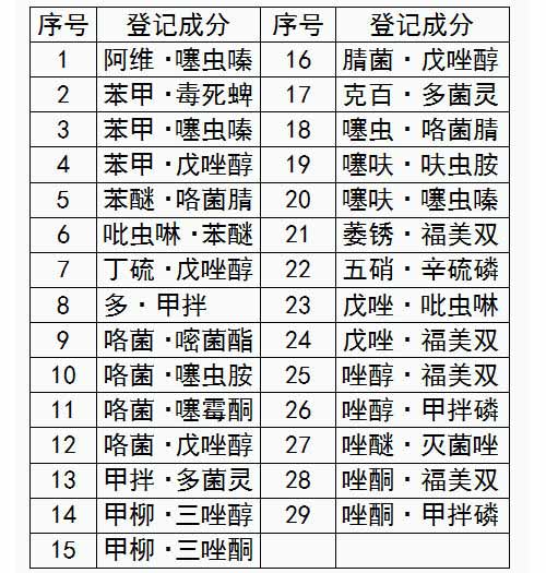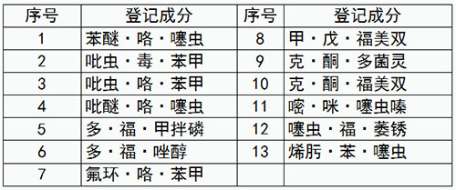 表1 登記數(shù)量排名前15的農(nóng)藥成分