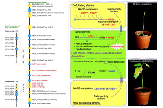 該團隊應用高通量測序技術解析了來自中國棉花的大麗輪枝菌基因組,通過與來自美國萵苣和荷蘭番茄上大麗輪枝菌基因組比較,發(fā)現(xiàn)中國菌株相對于美國和荷蘭的多出一個基因組片段,該片段系從與其長期混生的棉花枯萎病菌中“掠取”(基因水平轉(zhuǎn)移),從而獲得了對棉花的超強侵染能力。進一步研究發(fā)現(xiàn),該菌獲得這個基因組片段后,編碼的功能基因直接參與了引起落葉化合物(N-?;掖及罚┑暮铣珊娃D(zhuǎn)運。這種化合物一方面干擾棉花體內(nèi)的磷脂代謝通路,使棉花對一種叫作“脫落酸”的植物內(nèi)生激素更加敏感;另一方面扮演著與脫落酸相似的作用,使棉花的內(nèi)源激素系統(tǒng)紊亂,脫落酸不正常的大量合成,最終導致棉花葉片脫落。