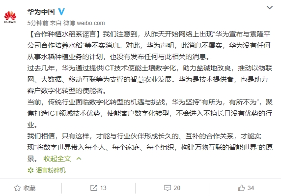 1月8日晚間消息,@華為中國 官微發(fā)布聲明稱,“華為宣布與袁隆平公司合作培養(yǎng)水稻”消息不屬實,華為沒有任何從事水稻種植業(yè)務的計劃,也沒有發(fā)布任何與此相關的消息。